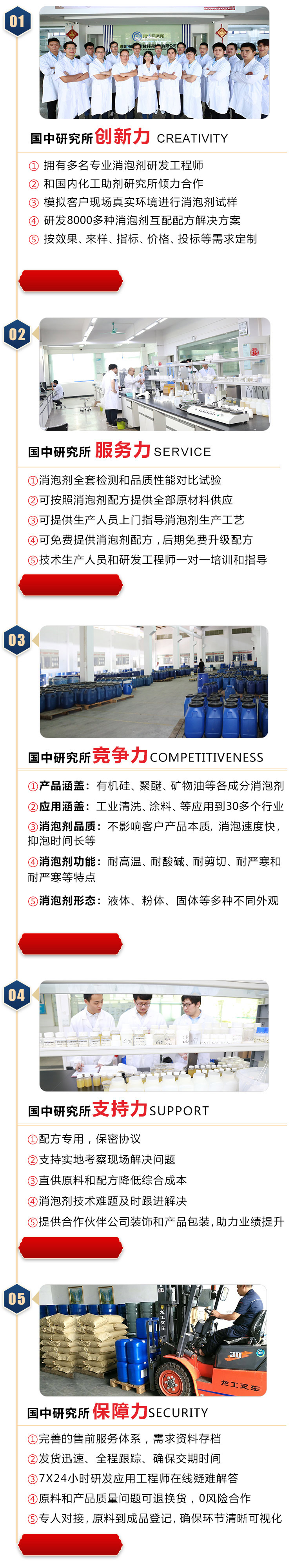 東莞市國中新材料研究所有限公司是一家集科研、生產(chǎn)、銷售、服務(wù)于一體的新材料研究所,擁有3000平方的研發(fā)基地,擁有一支專業(yè)消泡劑研究人員組成的研發(fā)團(tuán)隊(duì)。成立以來一直致力于消泡劑原材料、成品的開發(fā)以及客戶技術(shù)服務(wù),長期與國內(nèi)研究所合作研發(fā)消泡劑配方。